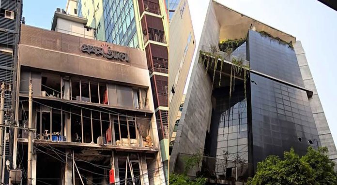 বিশেষ প্রতিবেদক: রাজধানীর কারওয়ান বাজারে প্রথম আলো কার্যালয় (বাঁয়ে) এবং ফার্মগেট এলাকায় ডেইলি স্টার কার্যালয়ে গত বৃহস্পতিবার রাতে হামলা-ভাঙচুরের পর আগুন ধরিয়ে দেয় এক দল মানুষ!