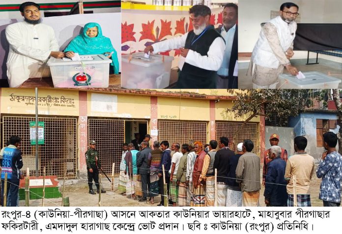 সরেজমিনে বিভিন্ন কেন্দ্র ঘুরে জানাগেছে, রংপুর-৪ সংসদীয় আসনে তিনটি দলের বেশ প্রতিদ্ব›িদ্বতাপূর্ণ পরিবেশ বিরাজ করছে। এই আসনে এনসিপির আখতার হোসেন (শাপলা কলি), বিএনপির এমদাদুল হক ভরসা (ধানের শীষ), জাতীয় পার্টির মাহবুবার রহমান (লাঙ্গল) ছাড়াও প্রতিদ্ব›িদ্বতা করছেন ইসলামী আন্দোলনের জাহিদ হোসেন (হাতপাখা), বাংলাদেশ সমাজতান্ত্রিক দলের (মার্কসবাদী) প্রগতি বর্মন তমা (কেচি), বাংলাদেশ কংগ্রেসের উজ্জ্বল চন্দ্র রায় (ডাব) এবং বাংলাদেশ খেলাফত মজলিসের আবু সাহমা (রিক্সা) এবং সতন্ত্র প্রার্থী শাহআলম বাসার (হরিন) এবং জয়নুল আবেদীন (ঘোড়া) প্রতীকে নির্বাচন করছেন। সকাল থেকেই আসনটির বিভিন্ন কেন্দ্রে ভোটারদের উপস্থিতি ছিল চোখে পড়ার মতো। নির্বাচন অবাধ ও সুষ্ঠু করতে প্রতিটি কেন্দ্রে কঠোর নিরাপত্তা ব্যবস্থা জোরদার করা হয়েছে। তিনটি দলের বেশ প্রতিদ্ব›িদ্ব প্রার্থী এনসিপির আখতার হোসেন (শাপলা কলি) তার মাকে নিয়ে ভোট দিয়েছেন কাউনিয়ার ভায়ারহাট বালিকা বিদ্যালয় কেন্দ্রে, এমদাদুল হক ভরসা (ধানের শীষ) হারাগাছ বহুমূখি উচ্চ বিদ্যালয় কেন্দ্রে এবং জাতীয় পার্টির প্রার্থী আবু নাসের শাহ মাহবুবার রহমান (লাঙ্গল) ভোট দিয়েছেন পীরগাছা ফকিরটারী সরকারি প্রাথমিক বিদ্যালয় কেন্দ্রে ভোট প্রদান করেন। রিটার্নিং কর্মকর্তার কার্যালয় সূত্রে জানা যায়, রংপুর-৪ (কাউনিয়া-পীরগাছা) আসনে মোট ভোটার রয়েছেন ৫ লাখ ৯ হাজার ৯০৬ জন। এর মধ্যে কাউনিয়া উপজেলায় ২ লাখ ১৪ হাজার ৩৫২ ও পীরগাছায় ২ লাখ ৯৫ হাজার ৫৫৪ জন। এ আসনটিতে পুরুষ ভোটার ২ লাখ ৫০ হাজার ৭৮৮ ও নারী ভোটার ২ লাখ ৫৯ হাজার ১১৩ এবং তৃতীয় লিঙ্গের ৫ জন ভোটার রয়েছেন। এ আসনটিতে মোট ১৬৩টি ভোটকেন্দ্রে ভোটগ্রহণ চলছে। বৃহৎ তিনটি দলের প্রার্থীই বলেছেন,তারা চান সুষ্ঠু, শান্তিপূর্ণ ও নিরপেক্ষ পরিবেশে ভোটগ্রহণ সম্পন্ন হোক। ভোটাররা যেন নির্ভয়ে তাদের ভোটাধিকার প্রয়োগ করতে পারেন। এদিকে কেন্দ্রটিতে আইনশৃঙ্খলা বাহিনীর সদস্যদের সতর্ক অবস্থান লক্ষ্য করা গেছে। এখন পর্যন্ত দুএকটি বিচ্ছিন্ন ঘটনা ছারা তেমন কোনো অপ্রীতিকর ঘটনার খবর পাওয়া যায়নি। এ সংবাদ লেখা পর্যন্ত সার্বিকভাবে শান্তিপূর্ণ পরিবেশেই ভোটগ্রহণ চলছে।