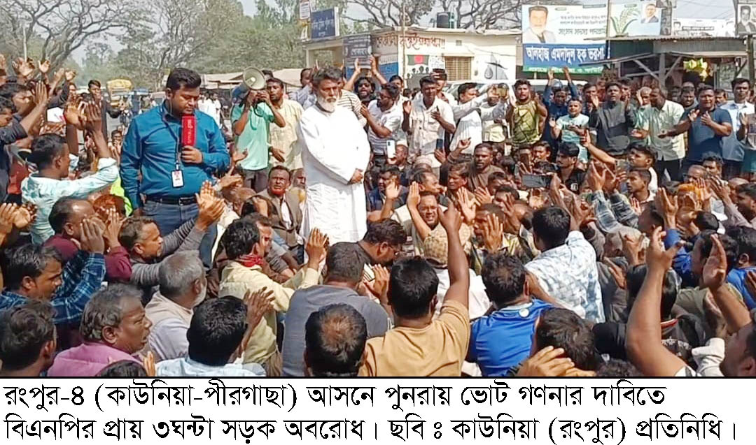 কাউনিয়া (রংপুর) প্রতিনিধি-রংপুর-৪ (কাউনিয়া-পীরগাছা) আসনে ভোট কারচুপি ও পুনরায় ভোট গণনার দাবিতে কাউনিয়া বালিকা বিদ্যালয় মোড় রংপুর-কুড়িগ্রাম মহাসড়ক শনিবার ১২টা থেকে প্রায় ৩ঘন্টা অবরোধ করে বিক্ষোভ করে ধানের শীষ প্রতীকের প্রার্থী এমদাদুল হক ভরসাসহ বিএনপির নেতা কর্মী ও হাজার হাজার সমর্থকরা।