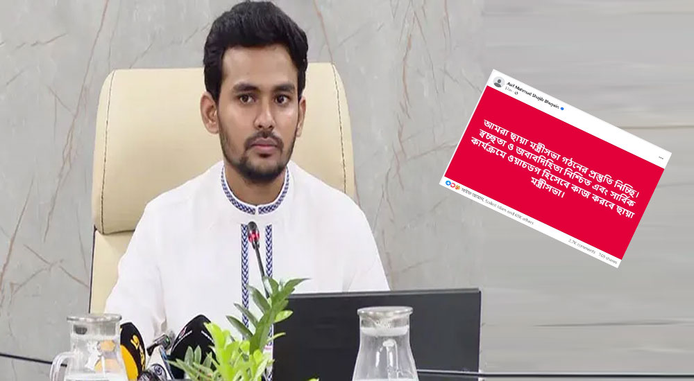 পোস্টে আসিফ মাহমুদ সজীব ভূঁইয়া লেখেন, ‘আমরা ছায়া মন্ত্রিসভা গঠনের প্রস্তুতি নিচ্ছি। স্বচ্ছতা ও জবাবদিহিতা নিশ্চিত এবং সার্বিক কার্যক্রমে ওয়াচডগ হিসেবে কাজ করবে ছায়া মন্ত্রিসভা।’