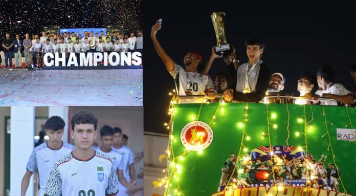 স্পোর্টস রিপোর্টার: সাফ অনূর্ধ্ব-২০ ফুটবল চ্যাম্পিয়ন হওয়া বাংলাদেশের খেলোয়াড়রা দেশে ফিরে উৎসব মুডে রয়েছেন। বিমানবন্দরে এক দফা অভ্যর্থনা দিয়েছেন ক্রীড়া প্রতিমন্ত্রী আমিনুল হক। সেখান থেকে ছাদখোলা বাসে চড়িয়ে হাতিরঝিলে এম্ফিথিয়েটারে সংবর্ধনা দেওয়া হয়েছে। খেলোয়াড়দের জন্য ১ লাখ টাকা করে পুরস্কারও ঘোষণা করা হয়েছে।