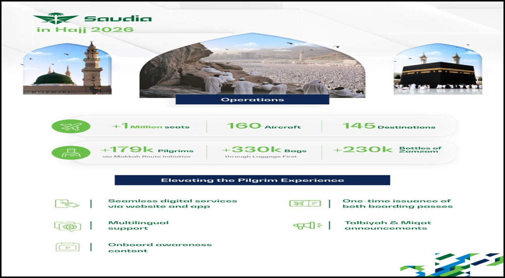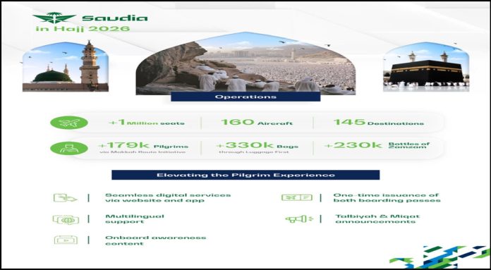 ২০২৬ সালের মরশুমের জন্য, সৌদিয়া তার অভ্যন্তরীণ এবং আন্তর্জাতিক নেটওয়ার্ক জুড়ে ১০ লক্ষাধিক আসন বরাদ্দ করেছে, যা হজ অপারেশনের জন্য নিবেদিত ১৬০টি বিমানের বহর দ্বারা সমর্থিত। বিমান সংস্থাটি তার সম্পূর্ণ পরিচালন এবং প্রযুক্তিগত সক্ষমতা কাজে লাগিয়ে বিশ্বব্যাপী ১৪৫ টি গন্তব্য থেকে তীর্থযাত্রীদের সেবা দেবে। পুরো মরশুম জুড়ে মসৃণ ও দক্ষ পারফরম্যান্স বজায় রাখতে সমস্ত অপারেশনাল সেক্টরে একটি নিবেদিত কর্মীবাহিনী চব্বিশ ঘন্টা মোতায়েন করা হয়।