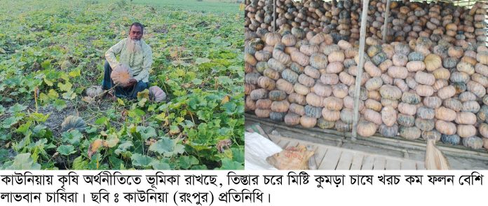 উপজেলা কৃষি স¤প্রসারণ অধিদপ্তর সূত্রে জানা গেছে, ১৭টি চরে ২৭৬ জন প্রান্তিক চাষি ১১৫ হেক্টর জমিতে কুমড়া চাষ করেছেন। তিস্তার চরাঞ্চলের মাটি কুমড়া চাষের জন্য বেশ উপযোগী। বিশেষ করে বালুময় মাটিতে পানি দ্রæত নিষ্কাশন হওয়ায় গাছের বৃদ্ধি ভালো হয়। ফলে ফলনও হয় বেশি। উপজেলা কৃষি কর্মকর্তা তানিয়া আকতার বলেন, আমরা কৃষকদের প্রশিক্ষণ ও প্রয়োজনীয় পরামর্শ দিচ্ছি। আধুনিক পদ্ধতিতে চাষ করলে কুমড়া আরও লাভজনক হতে পারে। তবে কিছু সমস্যার কথাও জানিয়েছেন কৃষকরা। তারা বলেন, চরাঞ্চলে যাতায়াত ব্যবস্থা দুর্বল হওয়ায় উৎপাদিত কুমড়া বাজারজাত করতে অনেক সময় ভোগান্তিতে পড়তে হয়। এছাড়া হঠাৎ বন্যা বা নদীভাঙনের ঝুঁকিও রয়েছে। এসব চ্যালেঞ্জ মোকাবিলা করে কাউনিয়ার তিস্তার চরে কুমড়া চাষ এখন সম্ভাবনার নতুন দিগন্ত উন্মোচন করেছে। সংশ্লিষ্টদের মতে, সরকারি সহায়তা ও বাজার ব্যবস্থাপনা উন্নত করা গেলে এই খাত থেকে আরও বেশি লাভবান হতে পারবেন কৃষকরা।