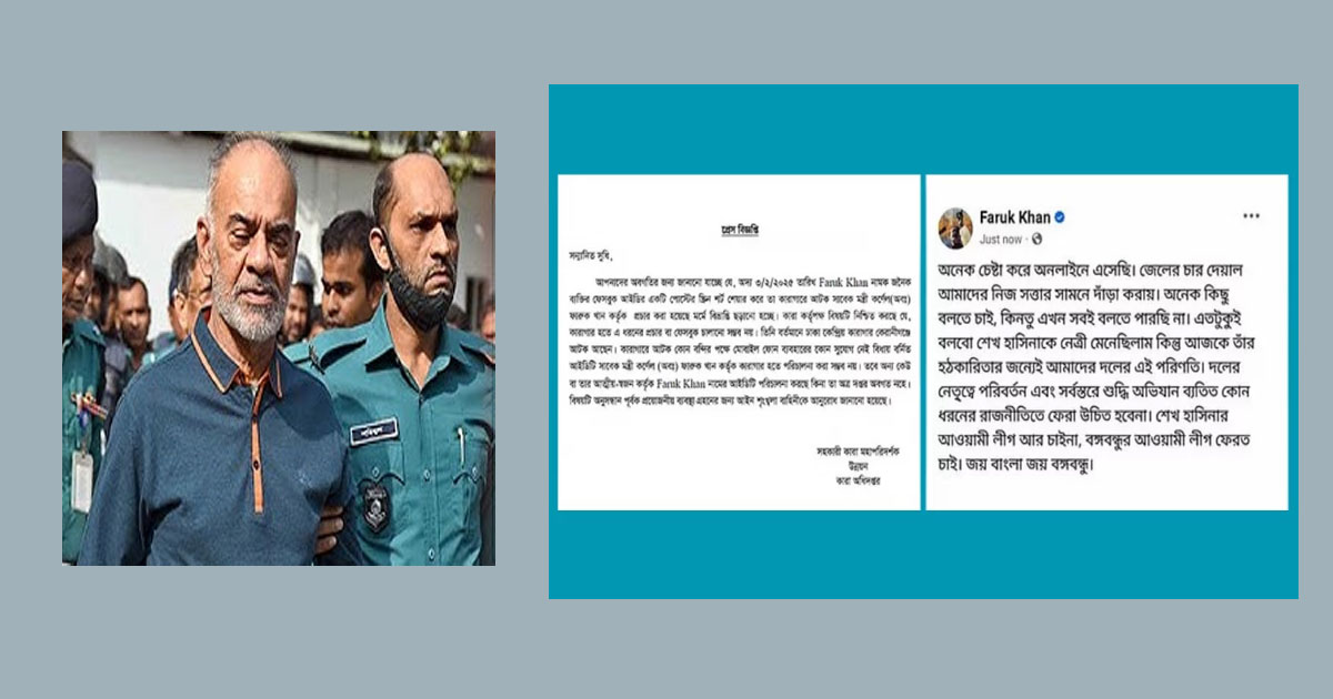 প্রসঙ্গত, সামাজিক যোগাযোগমাধ্যমে Faruk Khan নামের যে ফেসবুক পোস্টের কথা কারা কর্তৃপক্ষ উল্লেখ করেছে, সেটি ভেরিফায়েড ফেসবুক অ্যাকাউন্টে দেওয়া হয়েছে বলে স্ত্রিনশটে দেখা যাচ্ছে। ওই পোস্টে লেখা হয়, ‘অনেক চেষ্টা করে অনলাইনে এসেছি। জেলের চার দেয়াল আমাদের নিজ সত্তার সামনে দাঁড়া করায়। অনেক কিছু বলতে চাই, কিন্তু এখন সবই বলতে পারছি না। এতটুকুই বলব শেখ হাসিনাকে নেত্রী মেনেছিলাম কিন্তু আজকে তার হঠকারিতার জন্যই আমাদের দলের এই পরিণতি। দলের নেতৃত্বে পরিবর্তন এবং সর্বস্তরে শুদ্ধি অভিযান ব্যতীত কোনো ধরনের রাজনীতিতে ফেরা উচিত হবে না। শেখ হাসিনার আওয়ামী লীগ আর চাই না, বঙ্গবন্ধুর আওয়ামী লীগ ফেরত চাই। জয় বাংলা জয় বঙ্গবন্ধু।’
