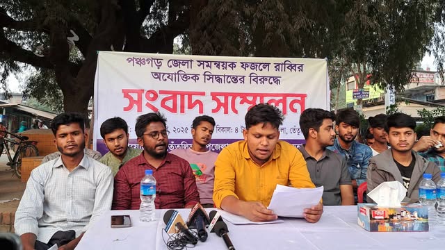 পঞ্চগড় প্রতিনিধি॥ পঞ্চগড়ের বৈষম্যবিরোধী ছাত্র আন্দোলনের সমন্বয়ক ফজলে রাব্বি গতকাল এক প্রেস বিজ্ঞপ্তির মাধ্যমে তেঁতুলিয়ার দুই ছাত্র সমন্বয়ককে বহিষ্কার করেন। এর প্রতিবাদে আজ সংবাদ সম্মেলনের ডাক দেয় বৈষম্যবিরোধী ছাত্র আন্দোলনের ছাত্র প্রতিনিধিরা।বৃহস্পতিবার বিকালে তেঁতুলিয়া উপজেলার চৌরাস্তা বাজারে সর্বস্তরের ছাত্র সমাজের ব্যানারে এ সংবাদ সম্মেলন অনুষ্ঠিত হয়।