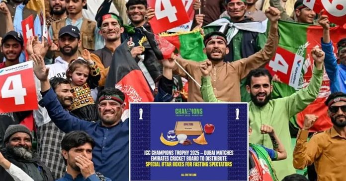 এমিরেটস ক্রিকেট বোর্ড (ইসিবি) এক্স পোস্টে বিষয়টি নিশ্চিত করেছে। ইফতার বিতরণের এই কার্যক্রম শুরু হবে ২ মার্চ নিউজিল্যান্ড-ভারত ম্যাচ থেকে। স্টেডিয়ামের বিভিন্ন স্ট্যান্ডে রোজাদার দর্শকদের ইফতারের ঠিক আগে বিশেষ বক্স দেওয়া হবে। যা দিয়ে দর্শকরা রোজা ভাঙবেন।
